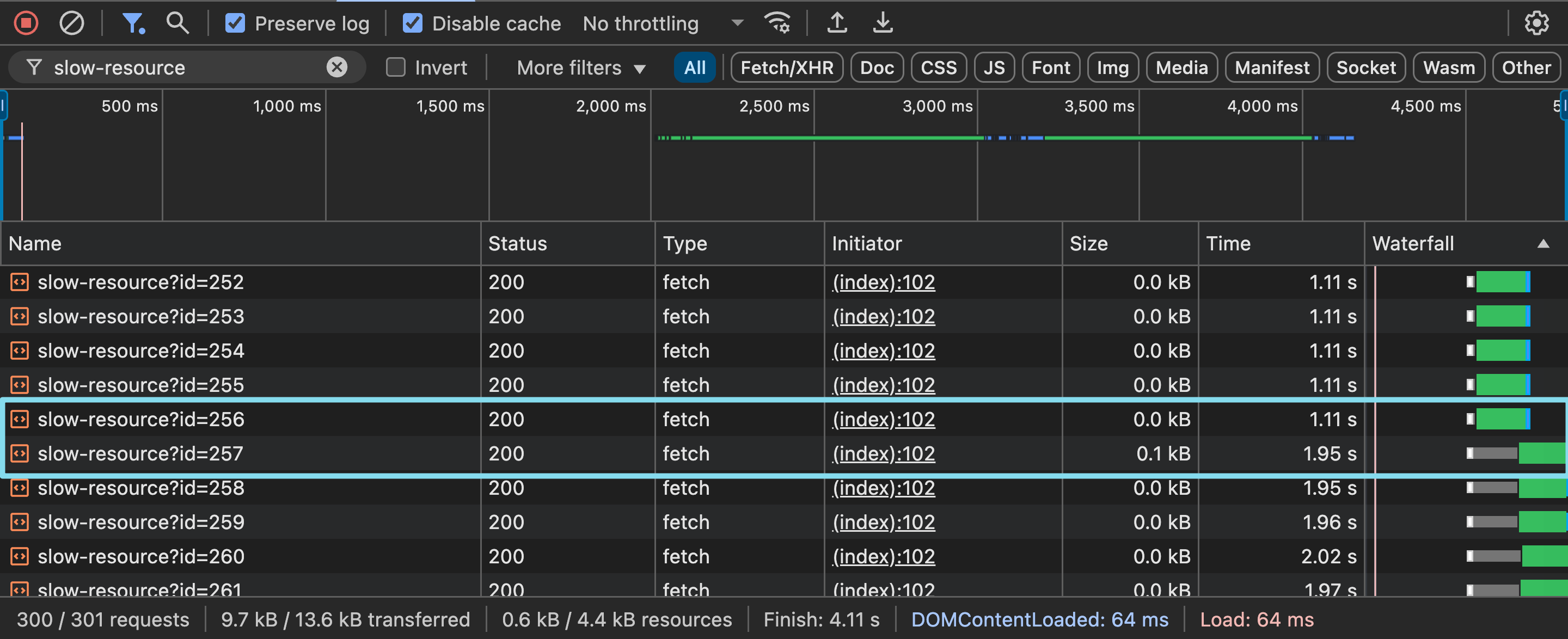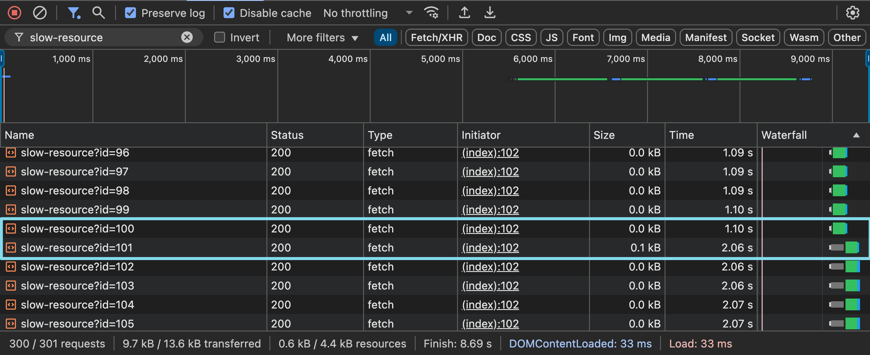 观察网络瀑布图。你会看到大约前100个请求被立即发送,